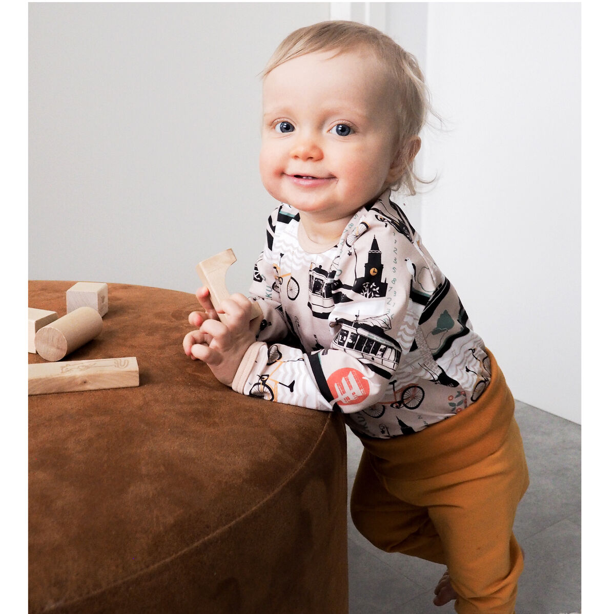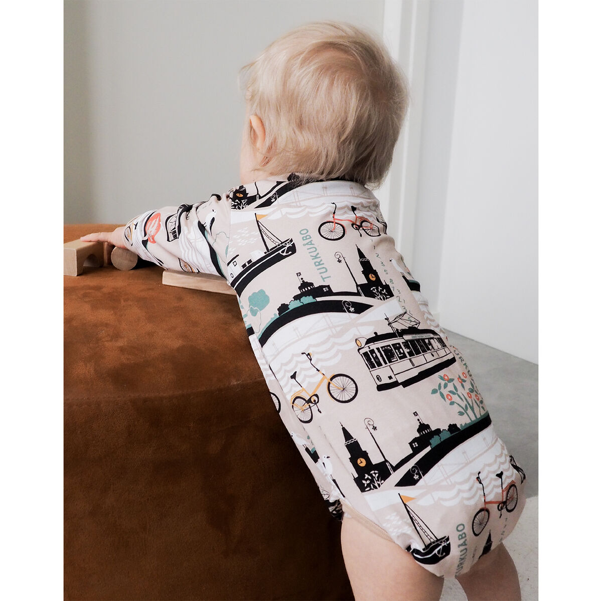 So this classic Kui-print called "täl puol ja toispuol" presents views from both of these sides of the river, like the old tramcar which retired to serve as an ice cream kiosk in the central market square during summers. We printed this pattern on a soft cotton jersey, so now kids can play in summery Turku - anywhere and all year round!